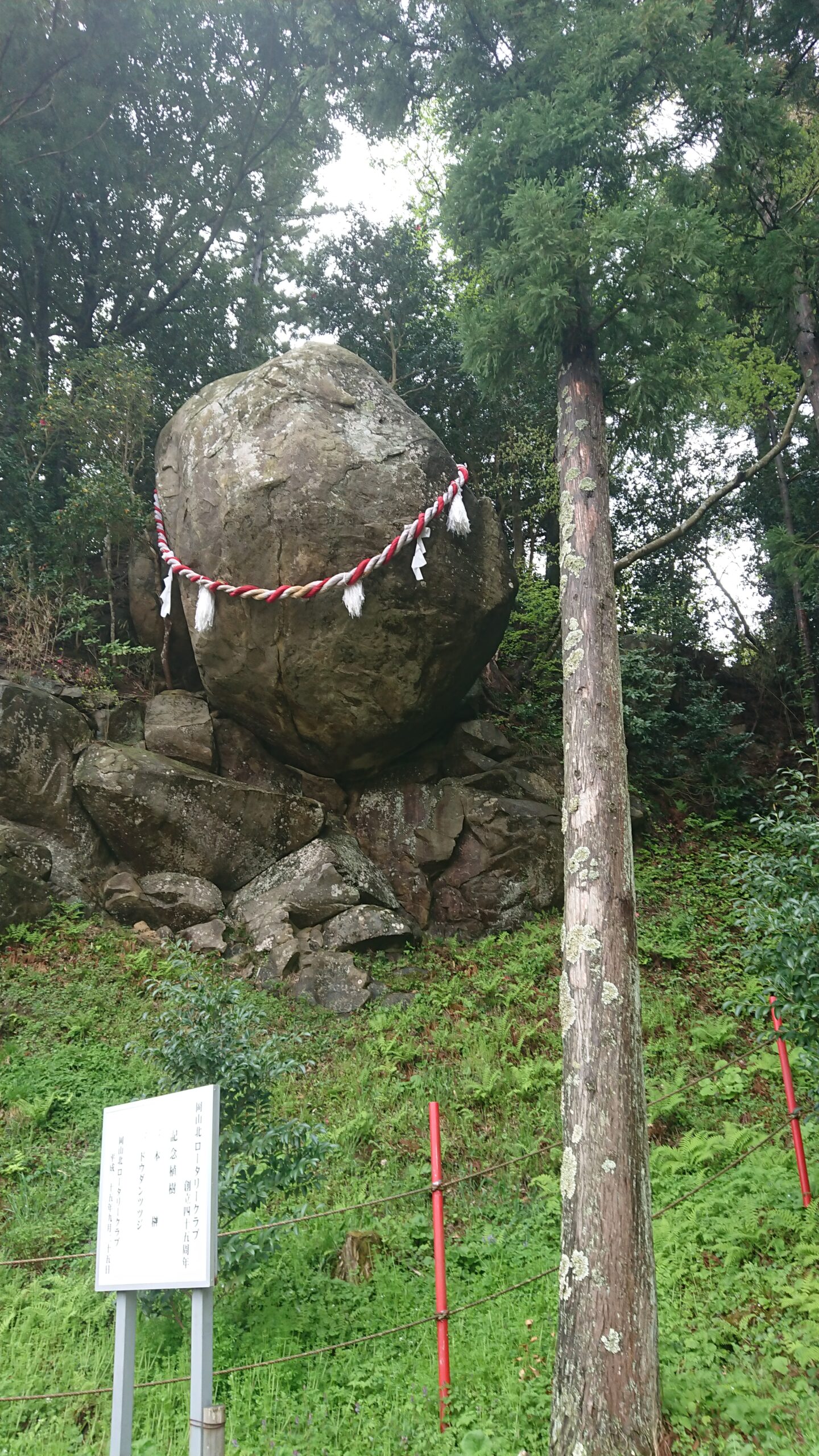 改めて写真を見返すと、石に巻かれた紅白の注連縄が、深い緑の背景の中で凛として見えます。