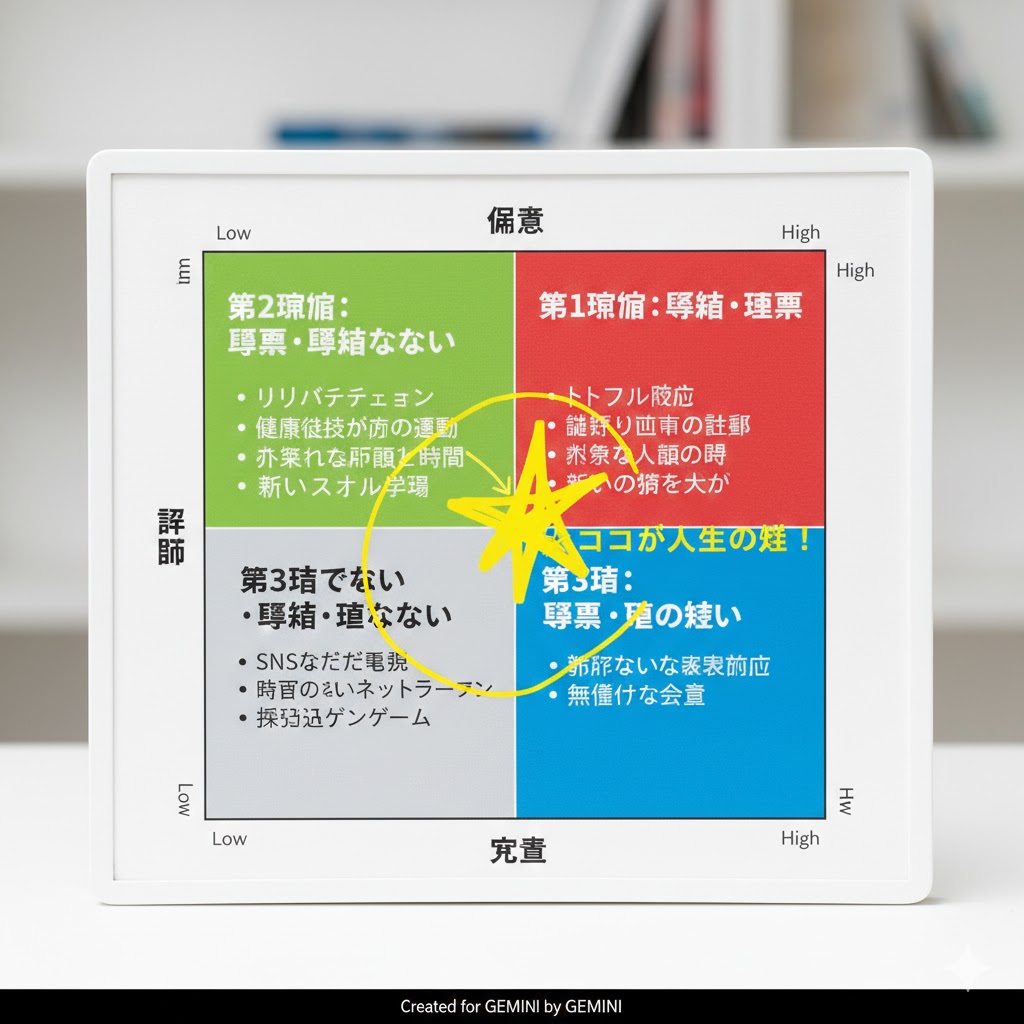 - 【第2領域】緊急ではないが、極めて重要 ★ココが人生の鍵! (例:リハビリ、健康維持、将来の夢への準備、スキルアップ、大切な人との時間)